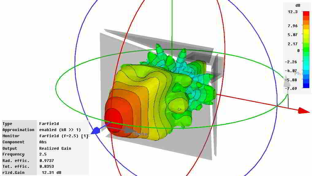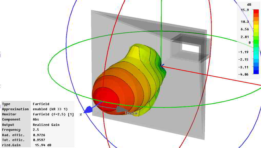 При добавлении рупора практически нет обратной реакции на излучатель, а значит антенна не расстраивается если вы меняете размеры рупора, материал и т.д.