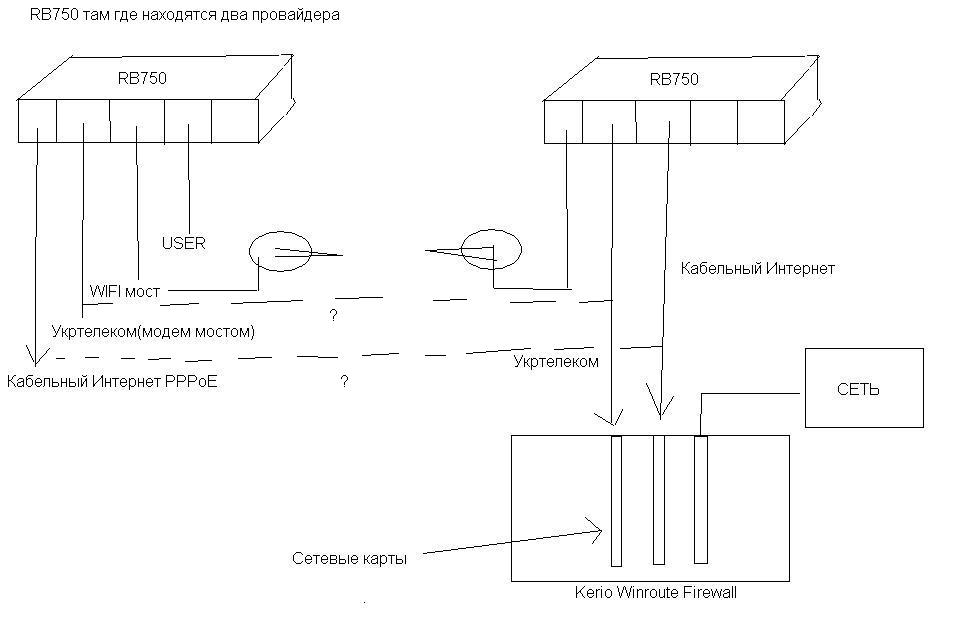 Помогите настроить такую схему, я на подобия спрашивал ну так ничего и не вышло настроить.Как настроить RB750 чтоб на машине с керио было два интерфейса точно как и на стороне провайдеров? на стороне провайдера есть одна машина ей тоже надо интернет от кабельного ISP. vlan,Eoip-tunnel? запутался помогите :).