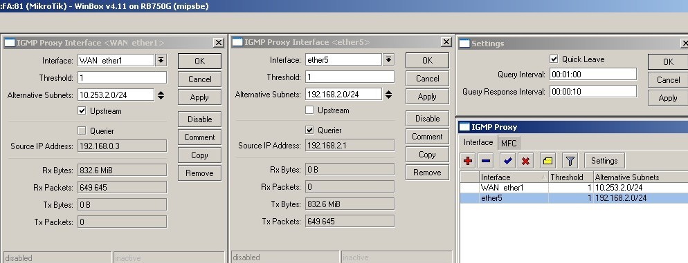Поставил 3.30 Подскажите настройки для IP-TV если не затруднит.Сообщение от alexandrov Посмотреть сообщениеПопробовал у себя сегодня на ТТК проброс udp - не вышло ) Поставил IGMP-Proxy на RB750G, настроил за 2 минуты - заработало сразу. Следовательно, если у вас 2.9.27 взломанный, то почему не поставить 3.30 взломанную?