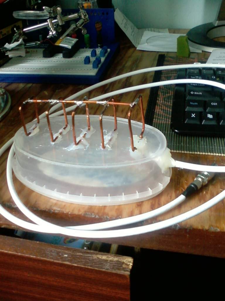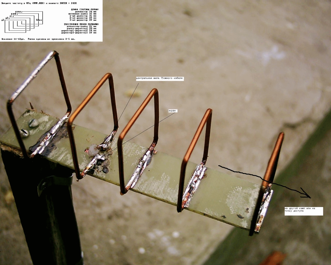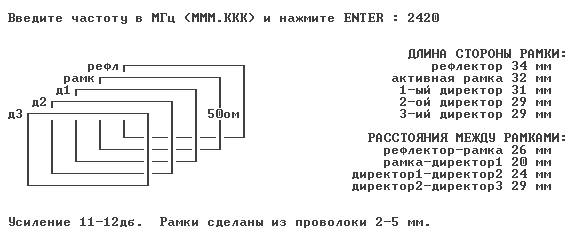 Предлагаю рассмотреть антенну из четырех последовательных директоров, и активной рамкой с выводами по середине