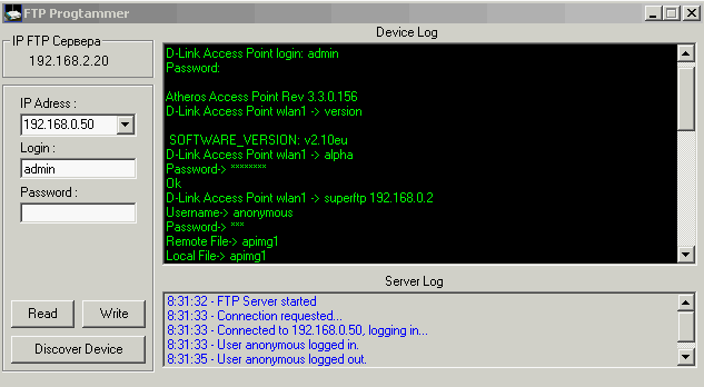 Вводим IP, логин, пассворд. Жмем нужную кнопку, указываем файл (для сохранения, или для записи). Ждем завершения процесса.