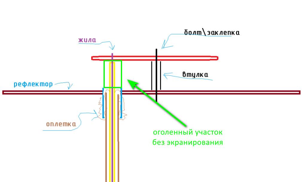 У меня была антенна на болтах, закреплена, она не работала, естественно оплетка на рефлекторе припаяна.