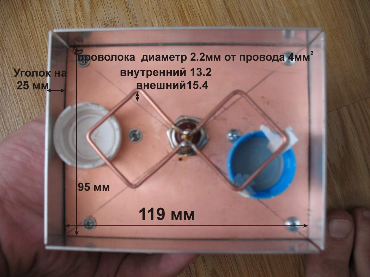 Добрый день. Представляю вам модифицированный облучатель отвектора (GL24110PR24). Для лучшего повторения я немножко модернизировал. 1.Корзину заменил на текстолит 119мм на 95мм и уголок на 25 мм. Биквадрат измедной проволоки взятой из изолированного провода 4мм2 диаметром 2.2 мм внутренний размен квадрата 30мм внешний соответственно 34.4, внутреннее расстояние от квадрата до корзины13.2 мм внешний 15.4мм, удобнее его гнуть с использованием подточенного уголкана 30 мм подтачиваем чтобы при загибе получать 30мм ровно и угол точно 900.Время изготовления сократил до 1.5 часов, на материалы ушло 130 рублей.Проверял свой вариант антенны на линке 13 км т.е. ставил заводскую антеннузамерял сигнал Блюбоксом, а потом ставил свою изменений не было тарелка быласупрал 0,9. Изготовил уже 3 штуки, изменения сигнала не заметил. Кому пригодитьсябуду рад.