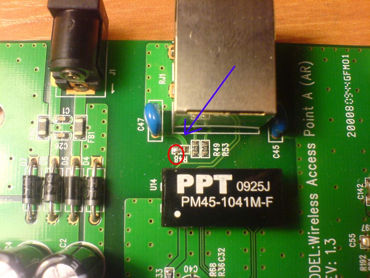 Собственно есть сабж, приобретенный для предоставления конечному пользователю (1-2 машины) временного безпроводного доступа в инет. ТД закидываеться куда либо поближе, и к ней идет только витуха с ПоЕ (трансформаторная развязка). Недавно возникла необходимость контролировать некоторые светодиоды и кнопку резета. Хочеться подпояться к порту РЖ45 на оставшиеся две пары. До этого на схему внимания не обращал, а тут вот какая трабла, оказывается все остальные ноги закороченны через резисторы (рис1 отмечено красным) на одну из ног входного трансформатора (рис2, рис3 отмеченно красным), плюс на эту ногу заведен еще экран РЖ45 (рис2 отмеченно синим).