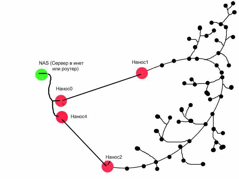 Изначально, в одной точке стоял "Нанос1" и туда закидывался траффик. От этой точки проводная локалка в частном секторе и росла. Через пару лет, она приобрела довольно дикий вид, ввиду того, что спрогнозировать появление новых абонов было никак нельзя, и кабель тянули куда попало, по мере появления новых заявок.