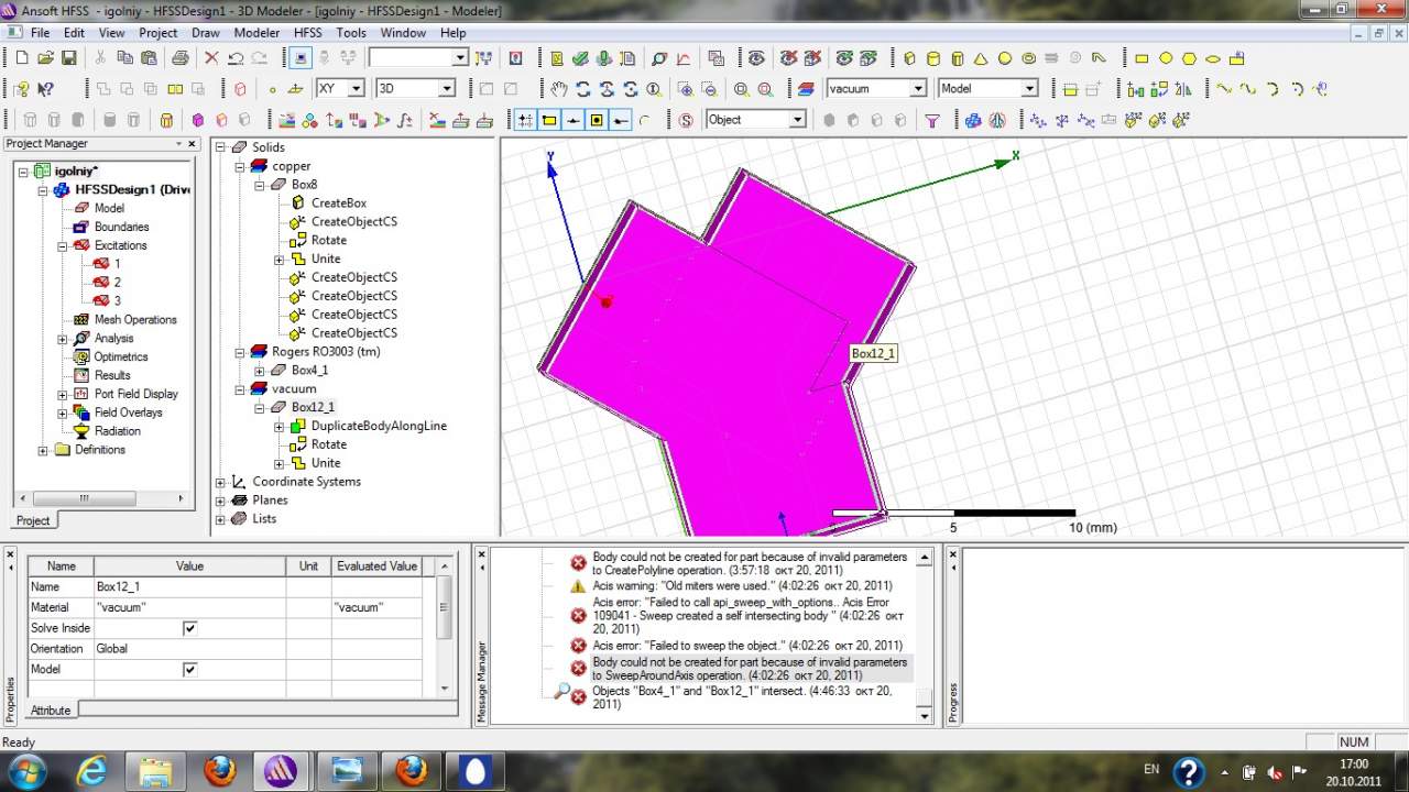 Всем привет, прошу помощи. В программе HFSS при попытке объединить 3 объекта 2 из них объединяется, а с 3м остается видимая граница и в окне Message Manager пишет ошибка: