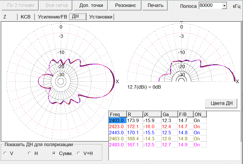 Там даже начало спирали не замкнуто на экран (а должно быть, т.к. источник сигнала в программе ставится в разрыв одного из проводов, т.е. один его конец как бы оплетка коаксиала, а другой - центральная жила. Не говоря уже о том, что у него не спираль а набор 8-гранных колец, соединенных отрезками провода. Я сделал нормальную спираль, честную (10 шагов на виток - для ограничения времени рассчета, можно было и плавней) - в экселе по формуле рассчитал и вставил в заготовленный файл *.maa - он ведь текстовый. Правда повозиться все же пришлось - результаты сначала были ни к черту - оказалось ошибся в формуле, да не заметил - шаг был не 0,25l, а почти 0,5l. Как исправил - все встало на места - сопротивление вышло 170 Ом и очень небольшая реактивность (ротхаммель пишет что она должна быть нулевой). Чувствительность получается 12,5дБ (относительно диполя на 2 меньше). Так о чем я - если в результатах программы посмотреть на диаграммы направленности и усиление антенны, то видно что они вообще не меняются (усиление растет от 12,4 на нижней границе диапазона до 12,7 на верхней). Резонансная частота, рассчитанная программой - около 2600МГц. А теперь мы сделаем антенну на 2 мм больше и с диэлектриком. Что получим? Получим смещение резонанса вниз и он даже войдет в интересующий диапазон и усиление даже вырастет на полдецибела. И объясни теперь - где мы делаем и рассчитываем неправильную антенну???