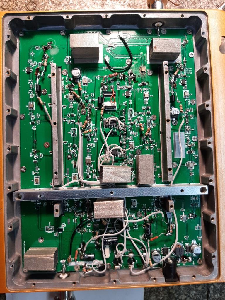 Если интермодуляция не позволяет поднять мощность, простой выход- два YG602020 параллельно. Ток одиночного выходного каскада в трёхдиапазоннике всего 60ма. До гнезда ещё три сумматора с длинными дорожками в диапазонах 1800+2100 или два сумматора в диапазоне 900. Мощности на покрытие не хватает.