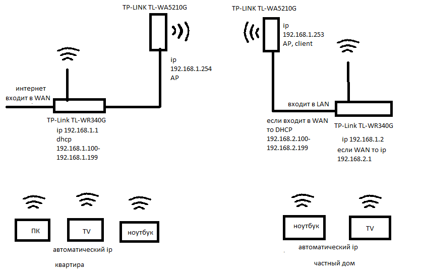 В частном доме настройки такие: у точки доступа ip 192.168.1.254, у роутера ip 192.168.1.1, у ноутбука ip 192.168.1.10, шлюз 192,168,1,254.