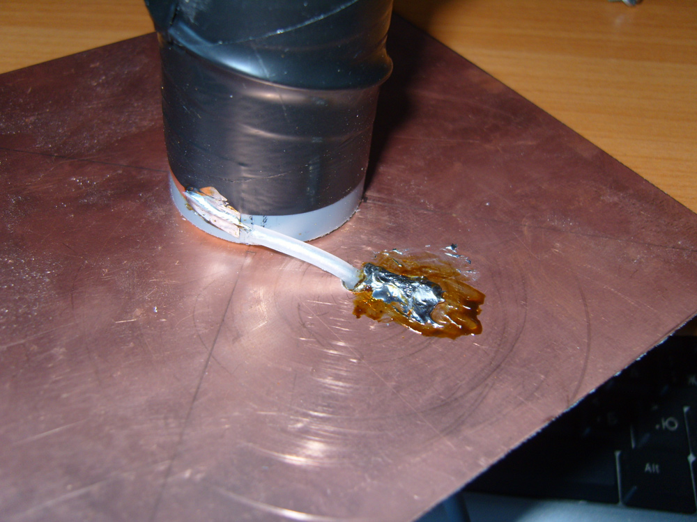 Спираль сделана из медного провода, изоляцию снял. Жилу примотал к трубке широкой изолентой в два слоя. Если попала влага под изоленту, может из-за этого нет сигнала? Коротит?