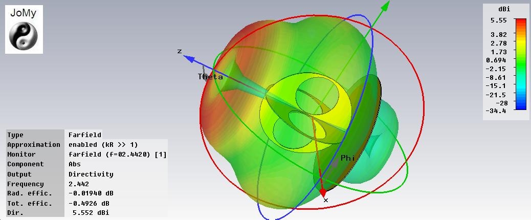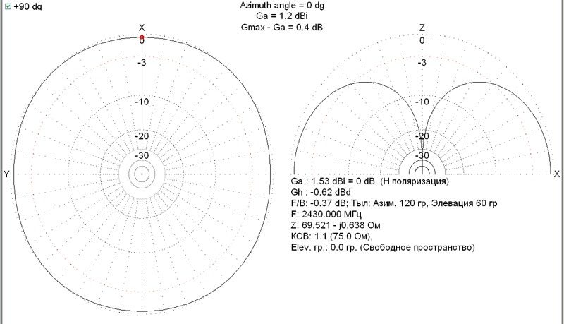 Ничего интересного! Два фашистских креста! Диаграмма хорошая, правильная, полностью идентична антенне "мальтийский крест", имеет 4 небольших провала до 1дБ. Лучше всего согласуется под 75 ом, под 50 ом на скорую руку не пошло. Усиление чуток меньше,чем у обычного полуволновика, но для круговой в горизонтали, вполне заслуживает внимания. Хорошо растёт усиление в стеке...