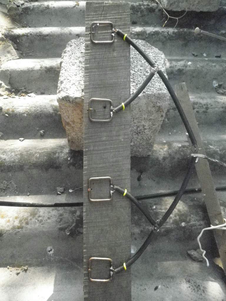 2 Попарно соединил рамки отрезками 75 Омного кабеля, проведя их вдоль одной из половинок рамки, через точку нулевого потенциала за рефлектор. Электрическая длина их должна быть кратна нечётному числу L/4.