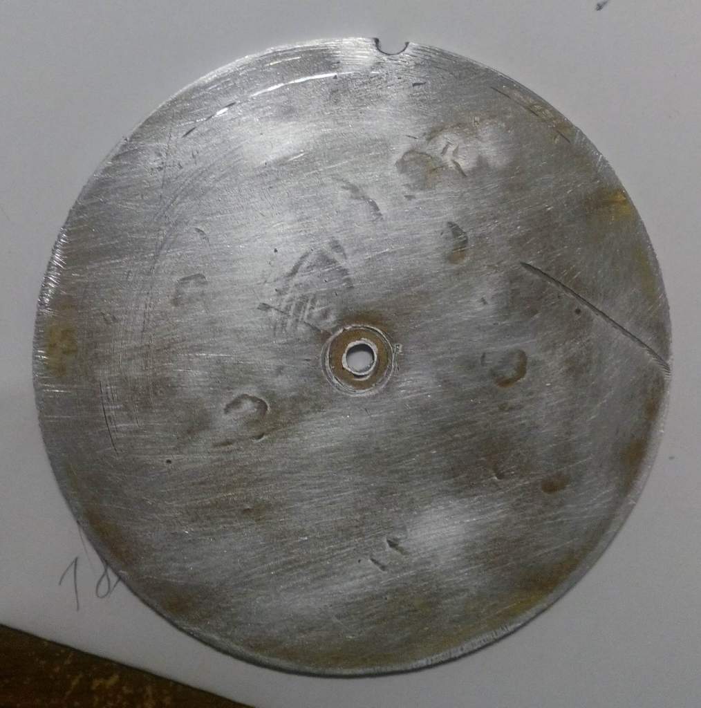 Нашел дырявую пластинку алюминия толщиной 2мм. И как раз одно середина одного из отверстий приходится на край диска. Пробовал запаять, но это то еще удовольствие.