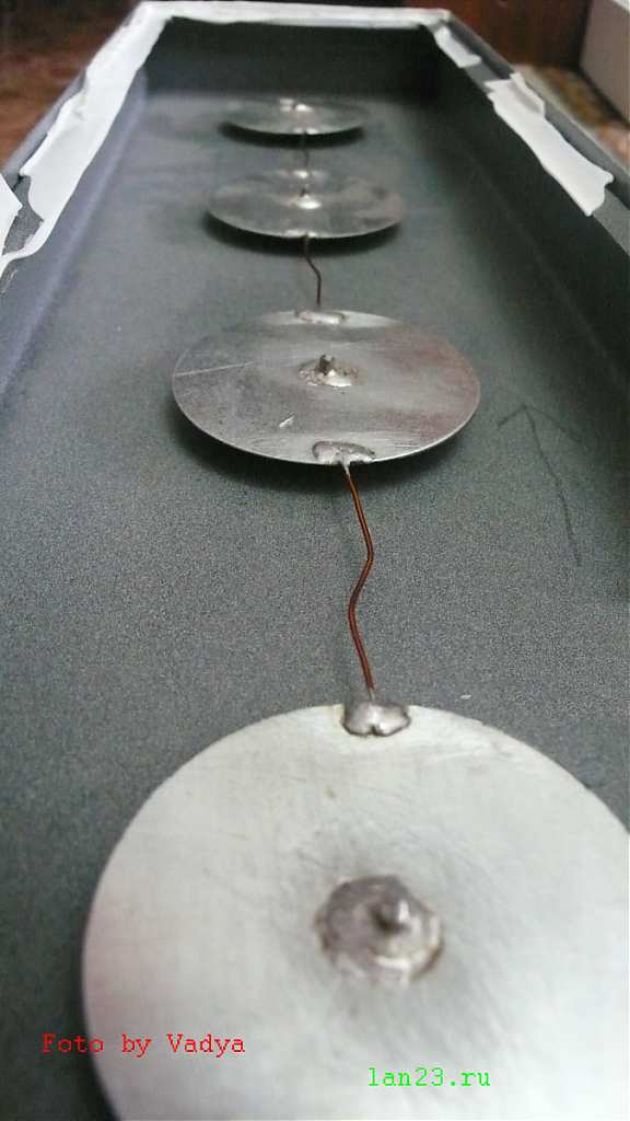 Вместо гвоздей используеться болты М3.5 длиной 10мм. В корыте сверляться отверстия 2.5мм,нарезаеться резьва. В 3 "блинах" аналогично.В том к которому паяеться разьем сверлиться 3.5 мм. Дырка под штырек разьема 4мм.