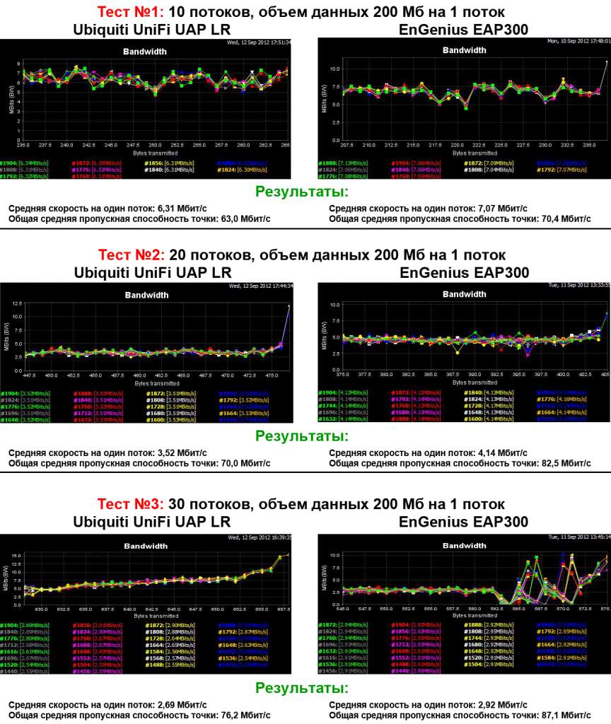 - Тестируемые Wi-Fi точки доступа: EnGenius EAP150/EAP300/EAP350, Ubiquiti Unifi-UAP. При тестировании использовался режим IEEE 802.11 B/G/N Mix Mode;