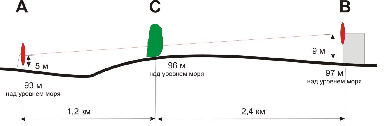 Но в самой точке «B» сигнала нет, хотя как раз в ней есть визуальная прямая видимость между антеннами.