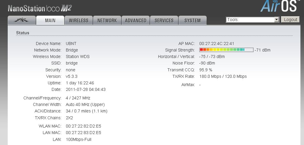 Привет всем! Имеются две станции, прямая видимость - (расстояние 150 м). Показатели такие: Signal Strenght - 69 dBm, Noise Floor - 90 dBm, Transmit CCQ 91%, TX/RX Rate - 180/120 Mbps, ширина канала 40 Мгц., используется 4 канал, частота 2427 Мгц. Реальная скорость прокачки 2500 кбайт/сек. Встроенный тест скорости - во вложении.