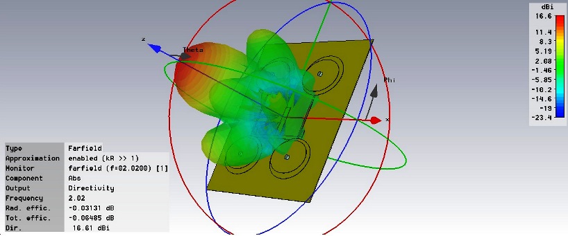Совсем избавиться от боковиков в такой антенне невозможно. У моей они тоже есть, смотри скрин ДН в плоскости Е, прошлый скрин ДН был для плоскости Н.