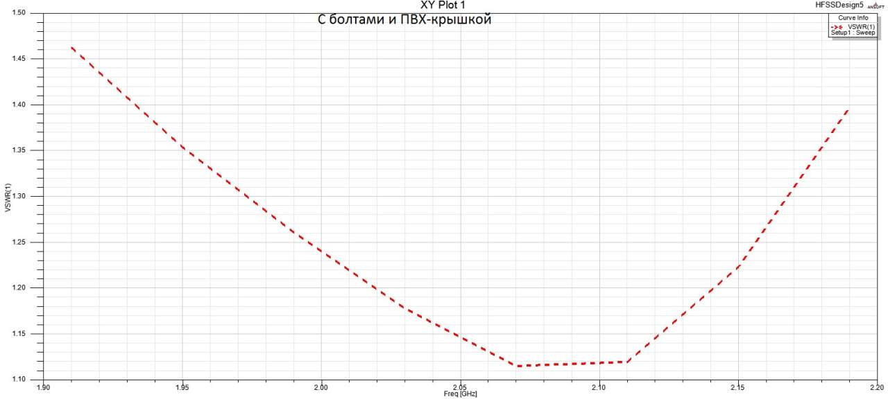 Но загнав в hfss, КСВ сместился в сторону приёма и расчетное усиление упало до 15 :). Параметры ПВХ забил E=3.2 , тангенс 0,02