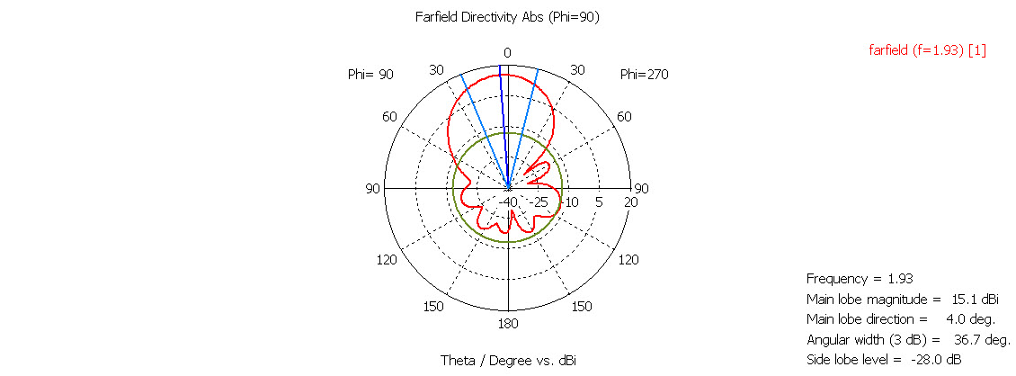 Совсем избавиться от боковиков в такой антенне невозможно. У моей они тоже есть, смотри скрин ДН в плоскости Е, прошлый скрин ДН был для плоскости Н.