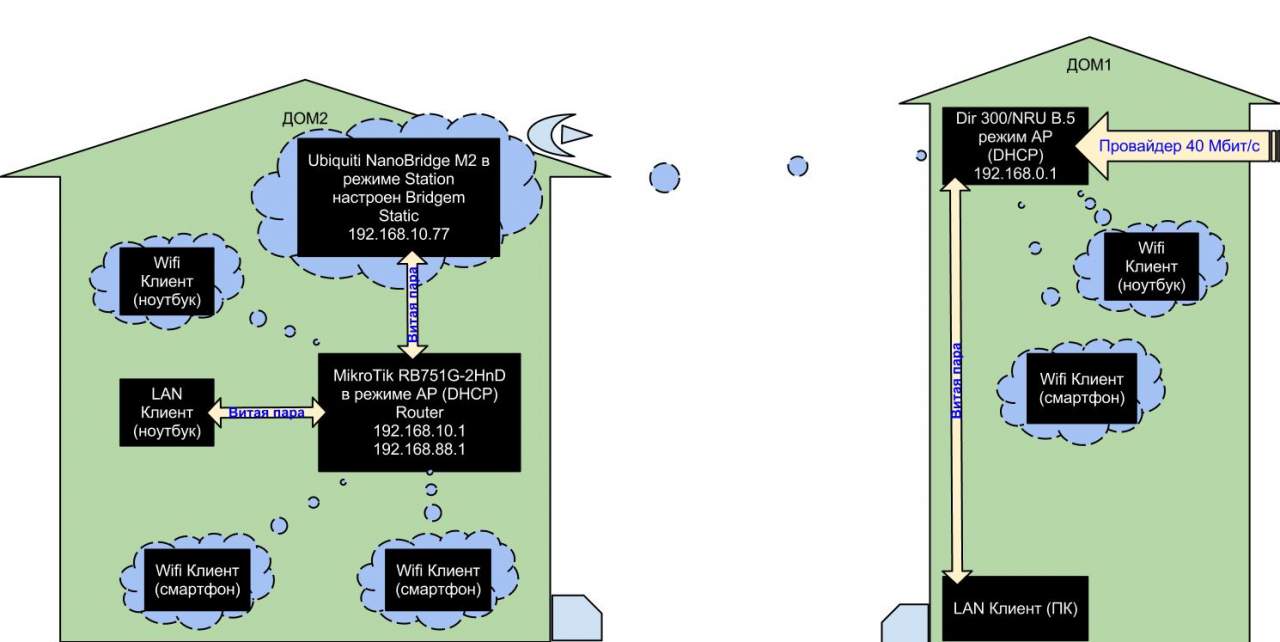 Интернет от провайдера принимает дир300, дальше по вайфаю я принимаю его на убикьюти который на прямую пускает его в микротик. Микротик раздает инет на устройства. К сожалению опыта строительства сетей нет, а друг который мне помог с настройкой сейчас не доступен, поэтому мне сложно даже описать как что устроено, постарался нарисовать все на схеме.