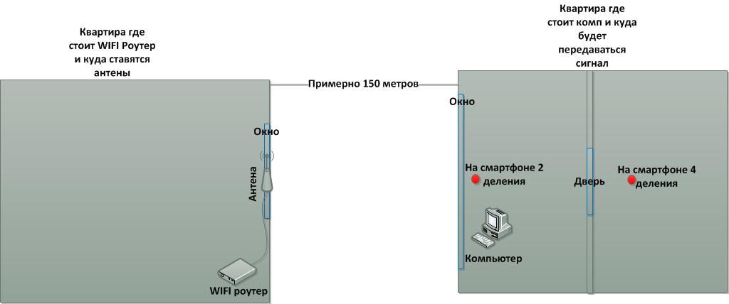 немного поясню схему: в квартире где стоит роутер - роутер находится почти возле окна, антенна цепляется на окно