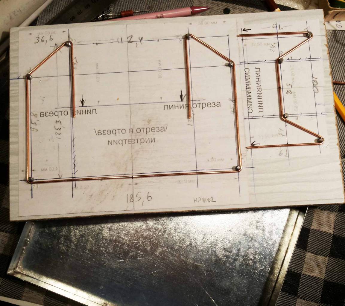 У меня пока сделан рефлектор и шаблон на котором согнул линии питания. Шаблон напечатал на самоклейке приклеил на ДСП, правда размеры при печати уползли почему то? Откорректировал, просверлил, закрутил М4 с обратной стороны, резьба препятствует соскальзыванию при гнутье.