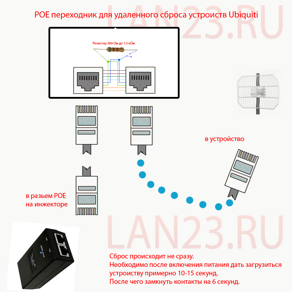 Увы и ах как только не извращался, но выше означенным способом сбросить AP не удалось. Подавал плюс с белосинего и синего на бело зеленый и с резистором 950 Ом и без, - толку никакого. Так и не понял, способ не работает на Airgrid M5 HP или я что-то не так делаю... Пришлось лезть на столб 9м высотой и сбрасывать кнопкой Reset на самой голове.