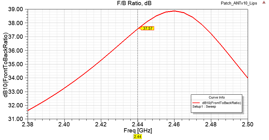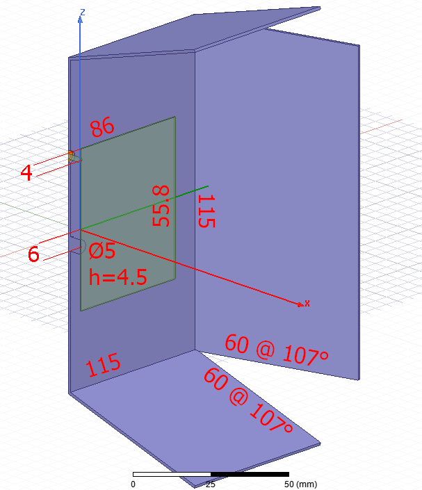 Добавил сверху/снизу бортики по 30 мм отогнутые на 20 градусов, резонанс сместился поэтому чуть увеличил размеры патча.