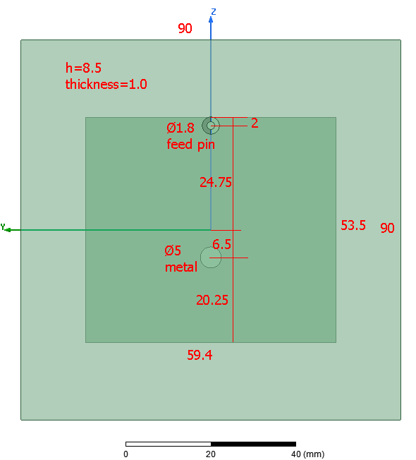 - неприкрытая оболочкой часть пина 3 мм (общая высота патча над рефлектором получилась 7.0 мм)