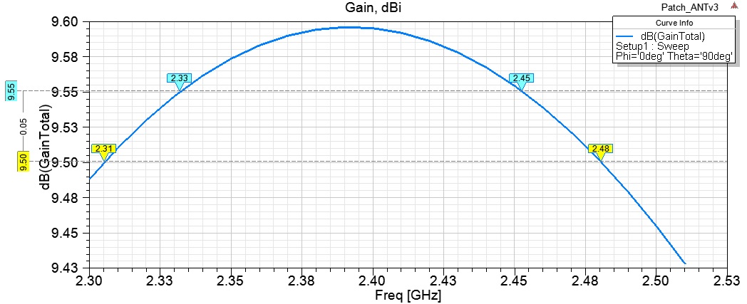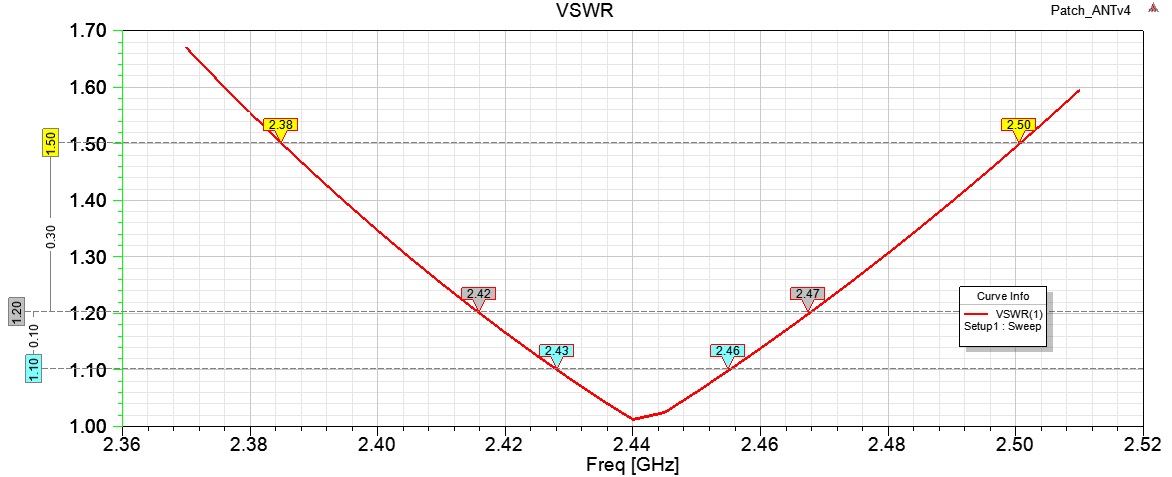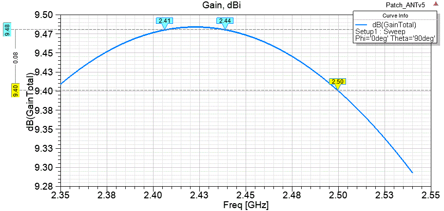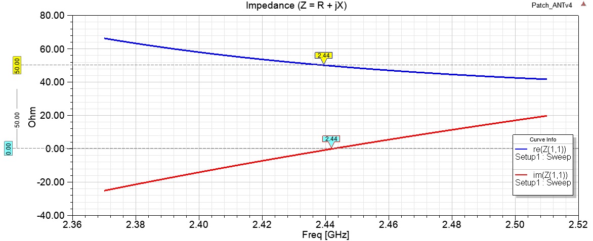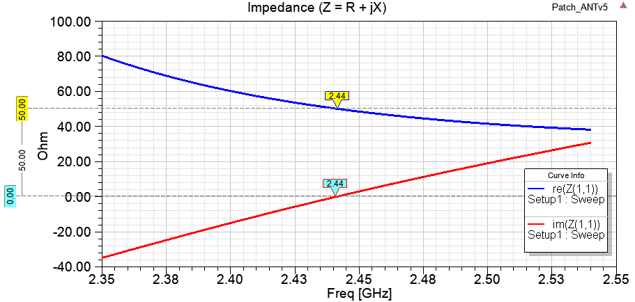 Пока отцентрировал на 2.44 ГГц, убрав по 1 мм с ширины и высоты патча 57х53.5 мм