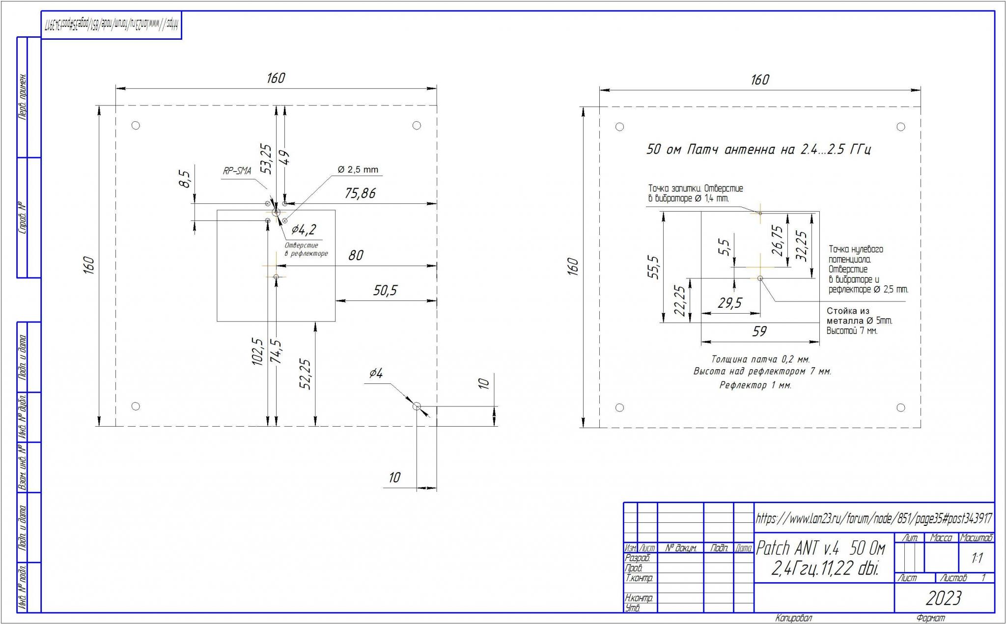 размеры патча для толщины 0.2 мм немного увеличил. длина 55.5 мм, смещение стойки и запитки не трогал пока.