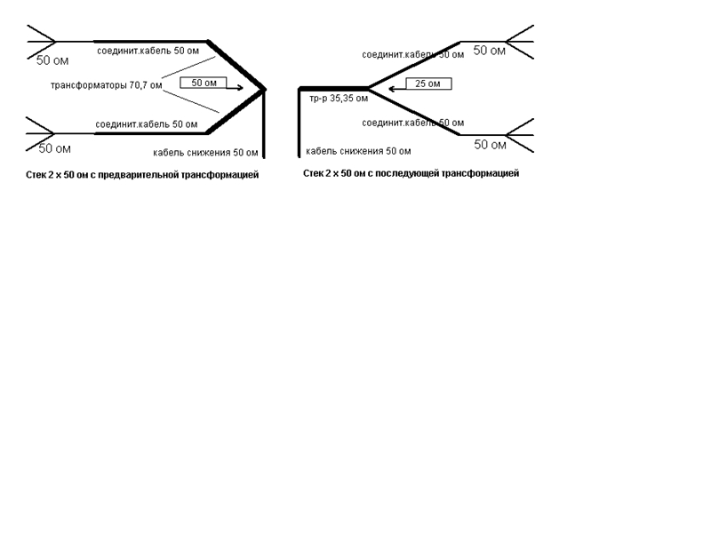 И оказалось,что есть два способа соединения антенн: 1. С предварительной трансформацией; 2. С последующей трансформацией.Более того,раньше я был уверен что при параллельном соединении кабелей например 50 Ом получится 25 Ом,(как для соединений резисторов),но оказалось что это не совсем так!