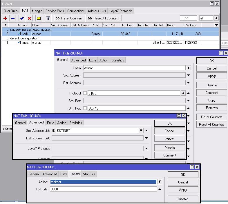 chain=dstnat action=redirect to-ports=8080 protocol=tcp src-address-list=!"ZADOLGNIK" dst-port=80.