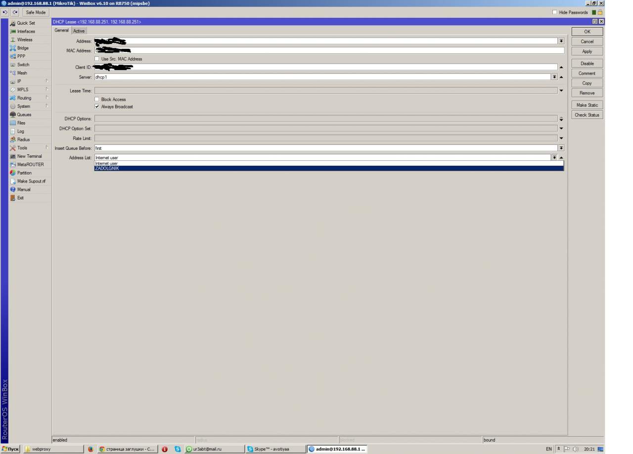 Потом чтобы выключить клиента в правеле дхцп сервера правило на клиента меняю на ZADOLGNIK и все когда клиент заходит в инет ему выдается страница из Files