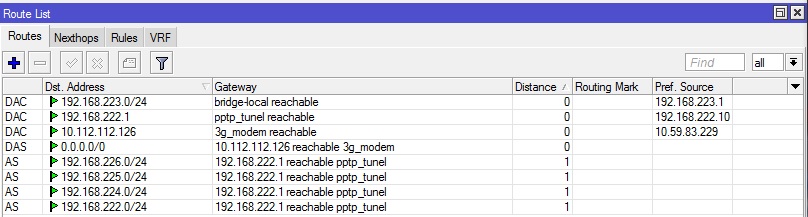 lte1 как WAN сюда приходит инет, остальные порты ether1 и wlan1 объединены в bridge-local (активен только ether1 остальные вырублены), так же есть pptp_tunel (он тоже включен в bridge-local) без галки add default route