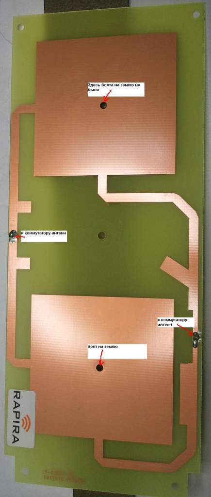 Добрый день. Есть три антенны из точек доступа, были привернуты на пластмассовых стойках и болтах к главной плате точки(со стороны общей сплошной земли), и один металлический болт на землю (в фотке все отметил как было в точке внутри). Откуда они и зачем сняли прошу не спрашивать, скажу одно эти точки работают себе как было задумано моим товарищем в проекте. Вот хочу из них сделать одну антенну (соединить три в синфазную решетку), стойки и болты сохранились так что не составит труда эти антенны привернуть на лист фольгированного текстолита сохранив заводскую высоту от экрана. Помогите как это сделать, а именно какое расстояние между ними должно быть, в каком порядке лучше разместить, и как это все по грамотному запитать. у антенны должно быть два выхода один я понимаю на вертикальную а другой на горизонтальную поляризацию, или можно все к одному разъему свести?