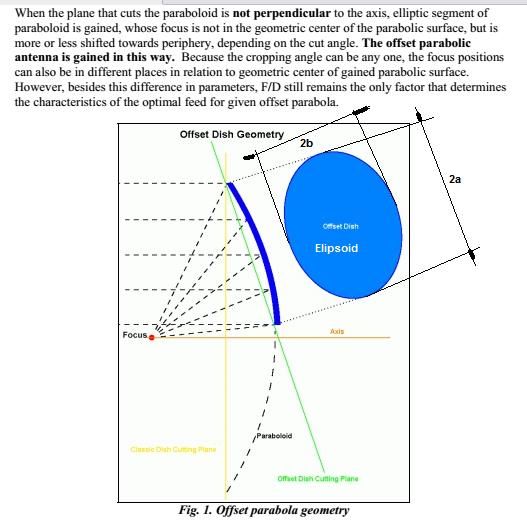 Если исходить из того, что офсет вырезан цилиндром, нижний край которого находиться на оси параболоида, как у большинства антенн Супрал, то все считается. Если ось ниже цилиндра, то точно посчитать невозможно, хотя известно, что обычно это расстояние равно половине диаметра рупора облучателя, тоесть 25-40 мм.Сообщение от shmel Посмотреть сообщениена самом деле это единственный вариант. еще один лишь вариант возможен это такая же парабола, но с установленным облучателем. имея просто зеркало на руках высчитать ничего нельзя.