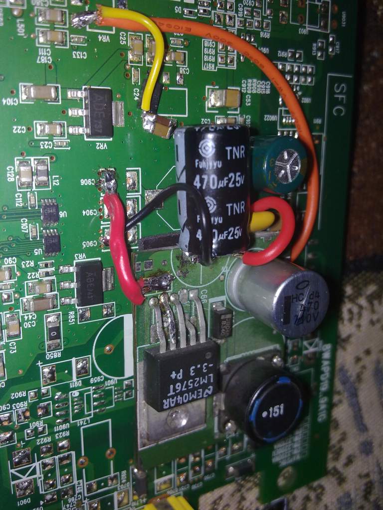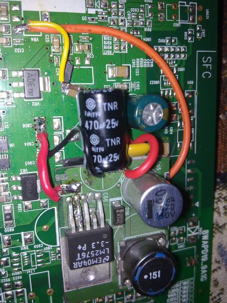 земля на плату два раза запаяна. Перед VR9 впаян LC фильтр из бусины со старого жесткого диска и пары керамических конденсаторов разной емкости. Плата приклеена на толстый двухсторонний скотч. Конечно конденсатор Fuhjyyu не к месту, но перепаивать как всегда лень. Посмотрим, как будет жить. надеюсь к моменту, как сгниет коробка, оптику к нам проведут.