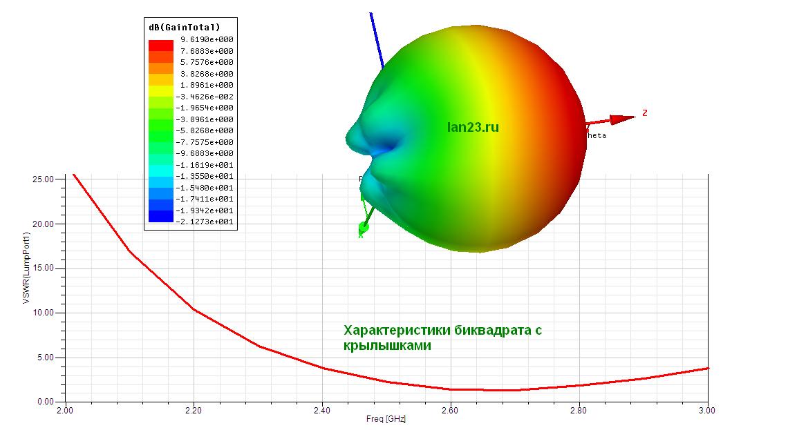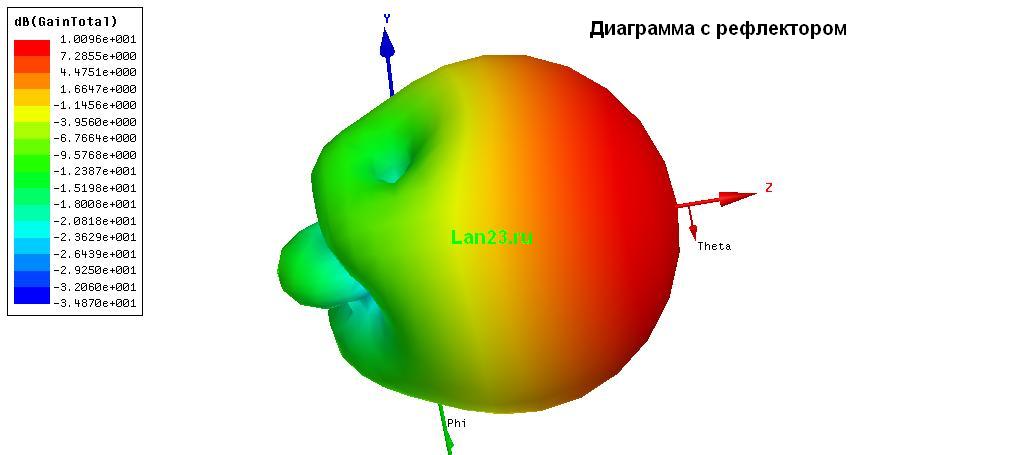 но когда в модель добавляю прямофокусный параболический отражатель диаметром 40 см и с фокусом 25 см.(облучатель в фокусе) то результат сильно меняется. а именно Z(1,1)=20.481+8.49.