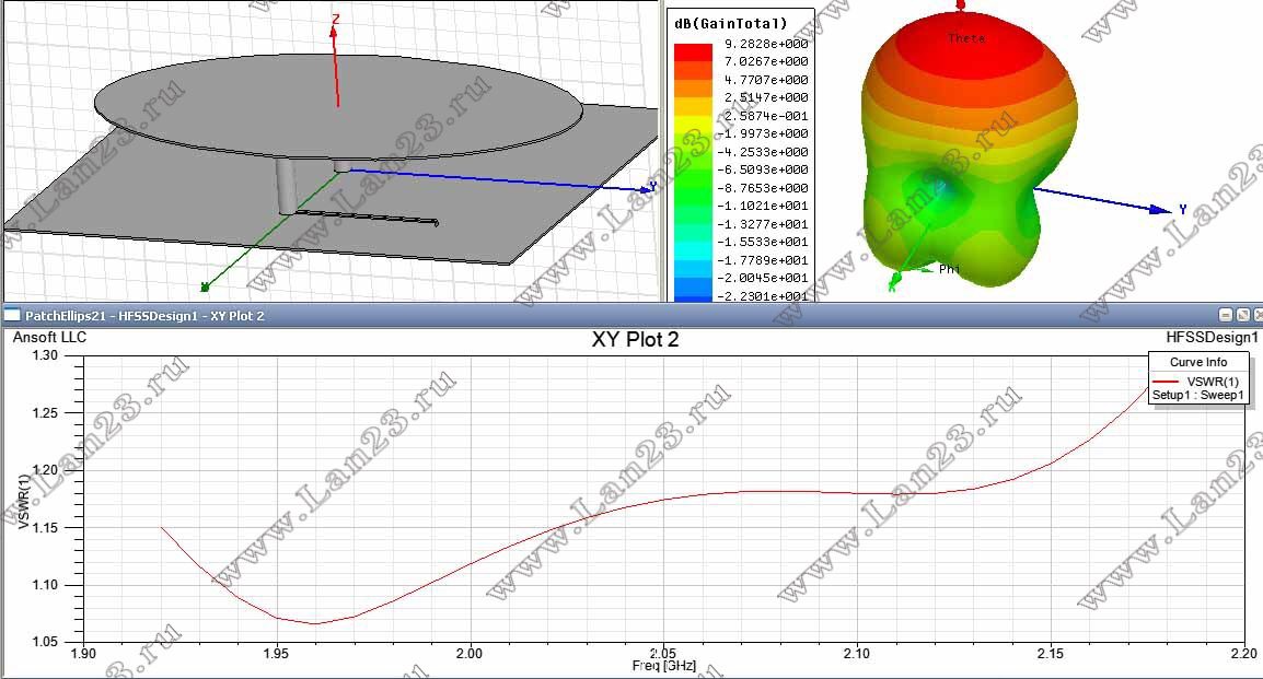 Если Вы желаете получить КСВ на рабочих частотах не выходящий за границы 1,5 то в этой конструкции и в варианте с эллиптической поляризацией необходимо отнести точку питания на 27 мм. и провести оптимизацию проекта по мин. КСВ. Переменные размеры дисков с шагом в 1 мм и зазор между дисками в 1 мм. Этого достаточно.